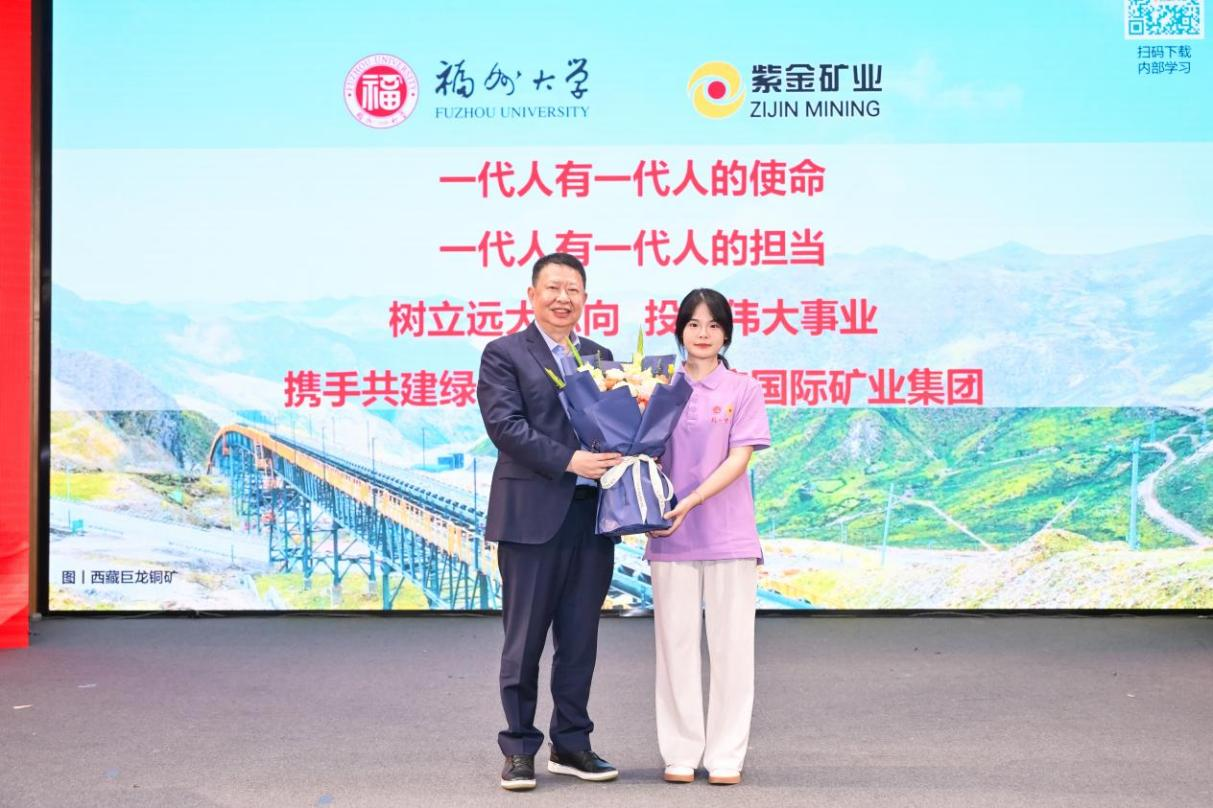 高年级学生代表陈昊泽同学,以亲身淬火的成长历程,分享他面对专业与职业规划选择的心路历程:从化学学院嘉锡班转入紫金学院地采复合型实验班,在老师的关心指导和同学们的无私帮助下,从焦虑、迷茫到自信、坚定;勉励同学们把握校企合作办学的双平台优势,依托福州大学“双一流”学府底蕴与紫金矿业世界500强全球视野,立足专业,视人生为旷野而非轨道,以无畏之姿深入实践,学习紫金矿业的勇气魄力,“敢于到资源丰富但风险之地开疆拓土”,为国家的资源安全和民族复兴伟业作出属于福大紫金人的贡献。