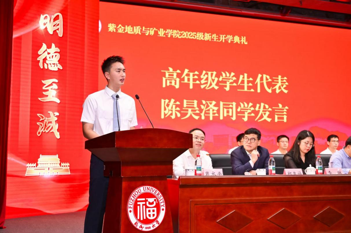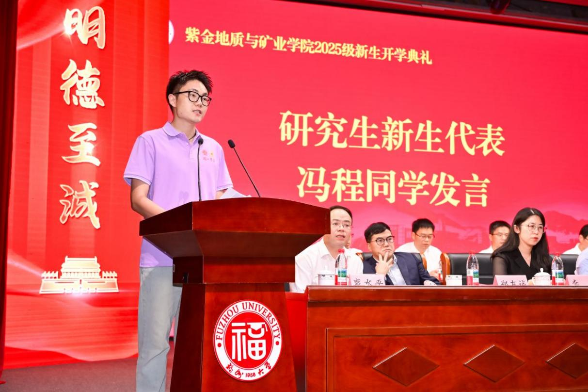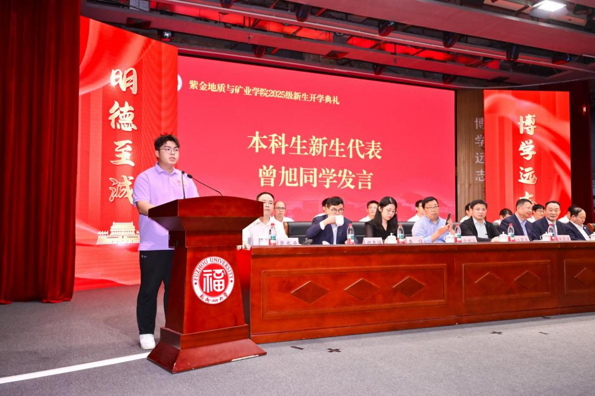 新生代表曾旭同学满怀热忱,表达了新紫金人的心声与憧憬。他动情诉说一家三代的矿业情缘,并激励同窗拒做“躺平”过客,争当沃土新苗——既要涵养仰望苍穹之志,亦需深植报效家国之情,在勤学实践中磨砺真才实学,立志将青春智慧,书写在祖国矿业科技自立自强的征程上!