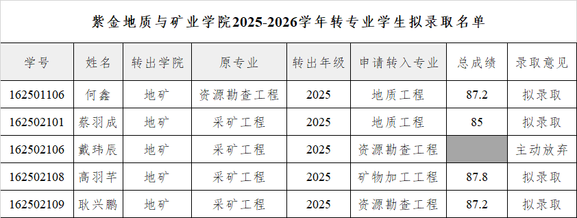 兹将紫金地质与矿业学院2025-2026学年转专业考核拟录取名单予以公示,公示期从2025年12月9日起算,公示期为三个工作日。公示期间接受实名来电,过期不予受理。电话:22865211(纪委监察)。