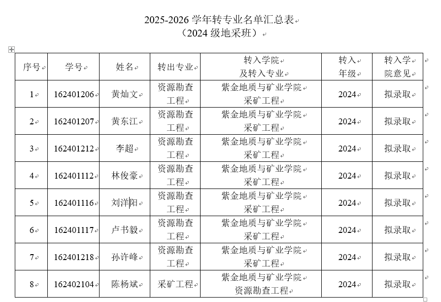 兹将紫金地质与矿业学院2025-2026学年2024级地采复合实验班转专业拟录取名单予以公示,公示期从2025年12月9日起算,公示期为三个工作日。公示期间接受实名来电,过期不予受理。电话:22865211(纪委监察)。