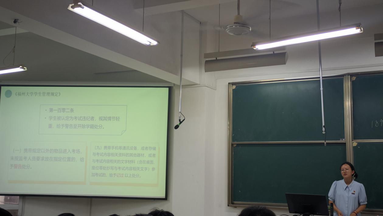 辅导员丘靖强调,《学生手册》是学生在校期间学习、生活的行动指南和行为规范,它不仅明确了学生的权利与义务,更是维护校园秩序、保障教育公平的重要依据。深入学习和严格遵守手册内容,对于每一位同学的成长成才至关重要。她希望全体新生能够认真听讲、深刻领会,将手册中的规定内化于心、外化于行,为即将开启的大学生活打下坚实的基础。 在核心解读环节,辅导员依托精心制作的多媒体课件,对《福州大学2025年学生手册》进行了系统而全面的串讲。主要强调了学籍管理、考试纪律、奖学金评定、宿舍管理规定、违纪处分办法以及校园安全等多个关键章节。讲解过程并非照本宣科,而是结合了大量生动的正反面案例以及现身说法,对学业警告、考试作弊后果、安全用电等同学们普遍关心且容易忽视的重点问题进行了深入浅出的剖析和强调。讲解逻辑清晰,重点突出,使原本略显枯燥的规章制度变得清晰易懂,引发了同学们的深入思考。