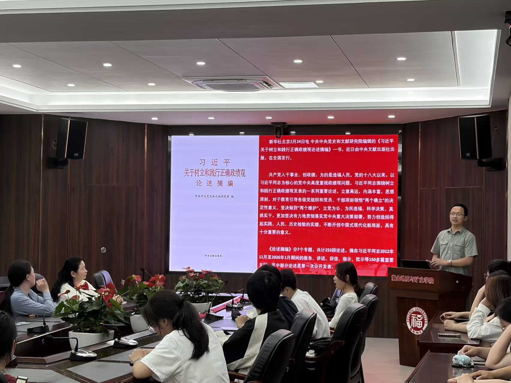 为引导学生干部筑牢思想根基、校准工作航向,近日,我院团委组织学院团委学生会、研究生会的学生骨干、团员代表开展“树立和践行正确政绩观”专题学习会,深入学习《习近平关于树立和践行正确政绩观论述摘编》核心内容,推动理论学习转化为服务同学的实际行动。学院团委副书记谢仁栩、研究生辅导员张彬等出席会议。