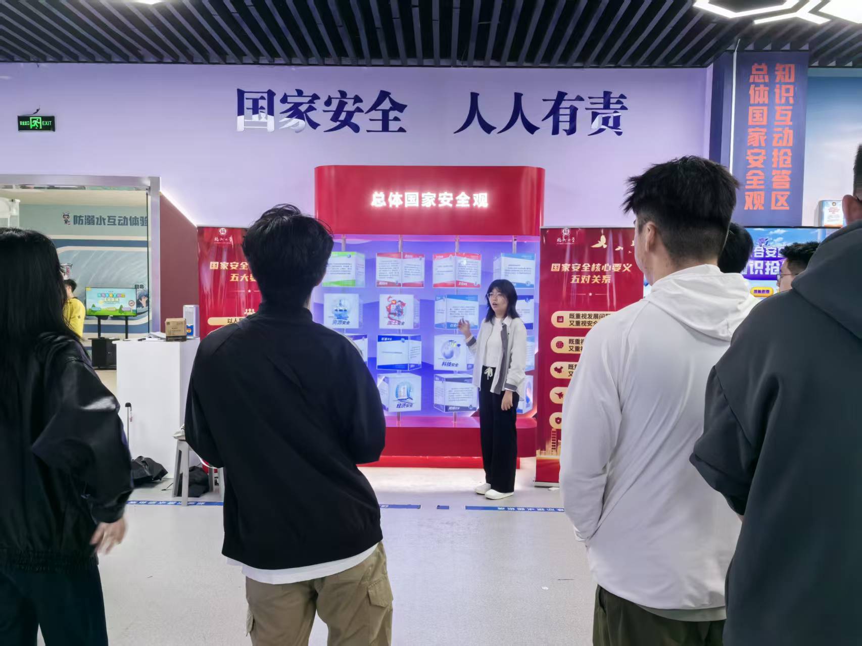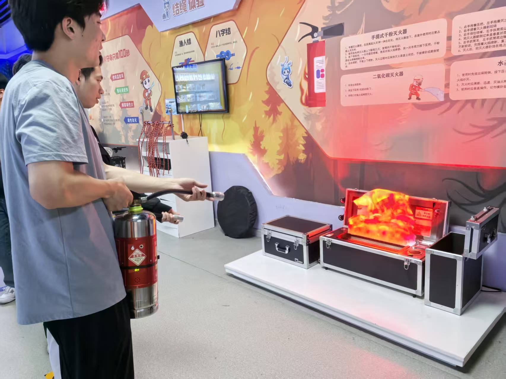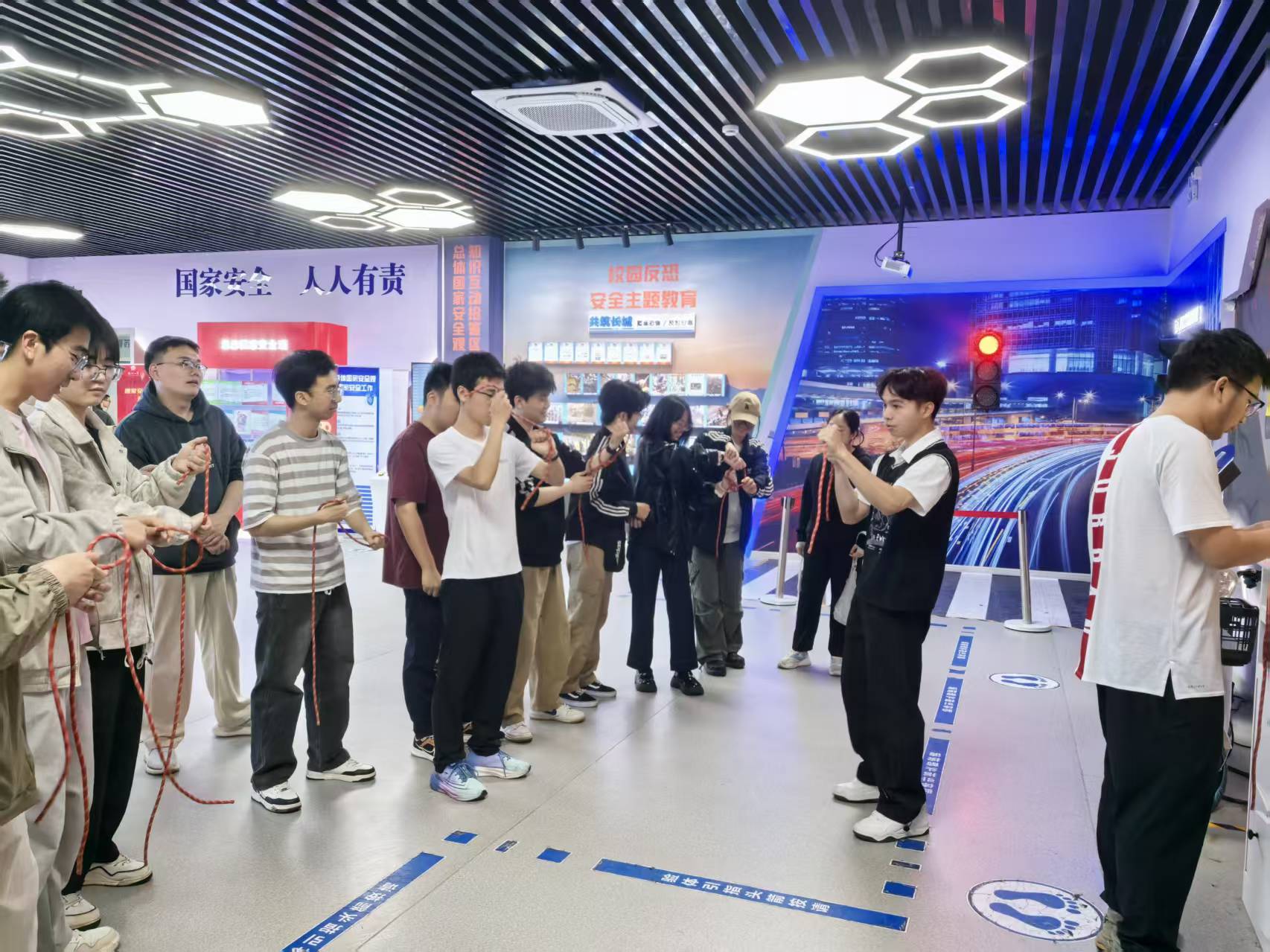 在展馆理论科普区域,讲解员围绕总体国家安全观核心内涵进行细致讲解,结合展板内容科普国家安全相关知识,结合校园实际普及各类安全常识,引导同学们树立安全防范意识,牢记青年学子的安全使命。随后同学们依次参与各项实操体验活动,在结绳教学环节认真学习逃生绳结打法,掌握应急自救技能;在消防实操区域,大家学习灭火器使用规范,上手完成模拟灭火演练,将安全理论转化为实战能力。活动全程同学们秩序井然、参与热情高涨,充分展现了良好的精神风貌,大家纷纷表示此次研学内容充实直观,不仅深化了总体国家安全观认识,更熟练掌握了消防、逃生、自救等实用安全技能。